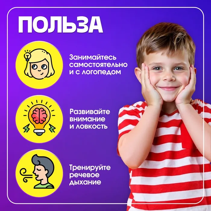 Научиться чётко говорить получится, если управлять своим дыханием. Этот набор поможет ребёнку произносить слова громко и красиво, а звуки — правильно. Игра развивает речевое дыхание малыша. Он выполнит все логопедические задания и весело проведёт время.