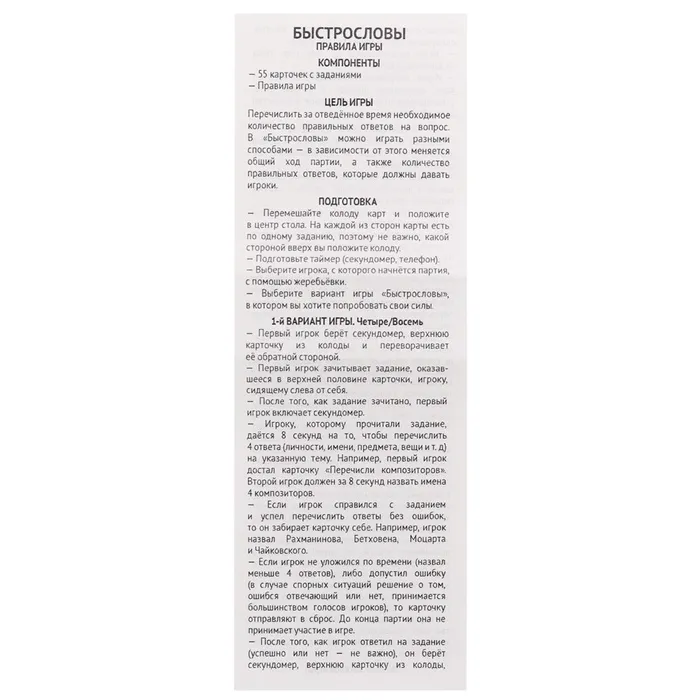 Это захватывающая и увлекательная игра, которая позволяет проверить свои навыки в быстром мышлении, логике и словарном запасе. Состоящая из 55 карточек, эта игра предлагает уникальный опыт и развивает не только интеллектуальные способности, но и коммуникативные навыки. Каждая карточка в игре "Быстрословы" содержит различные слова и фразы, которые игроки должны использовать для составления своих ответов. Цель игры заключается в том, чтобы как можно быстрее придумать слово или фразу, начинающуюся на последнюю букву слова, указанного на предыдущей карточке. Игроки должны быть быстрыми и творческими, чтобы придумывать новые слова и не повторяться."Быстрословы" подходит для игры как в кругу семьи или друзей, так и на вечеринках или в командной соревновательной форме. Эта игра способствует развитию речи, памяти, внимания и быстроты мышления. Кроме того, она помогает расширить словарный запас и улучшить коммуникативные навыки. В "Быстрословах" каждый игрок имеет возможность проявить свою креативность и остроумие, придумывая оригинальные и необычные слова. Благодаря разнообразию карточек, игра никогда не становится однообразной или предсказуемой. Каждый раунд предлагает новые вызовы и возможности для проявления своих способностей. Благодаря простым правилам и интересному геймплею, игра легко усваивается и подхоит всем возрастным группам. Выводя на новый уровень вашу способность быстро мыслить и находить оригинальные решения, карточная игра "Быстрословы" обещает множество часов увлекательного и интеллектуального развлечения. Увлекательная кооперативная игра, которая позволит вам применить логику и научиться работать в команде!