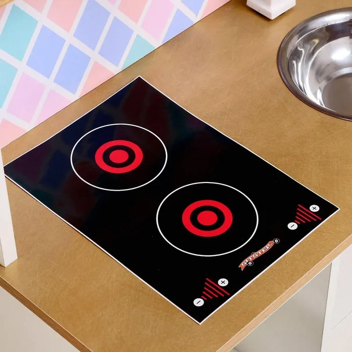 - Плита с двумя конфорками выполнена в виде наклейки — безопасно даже для малышей.
