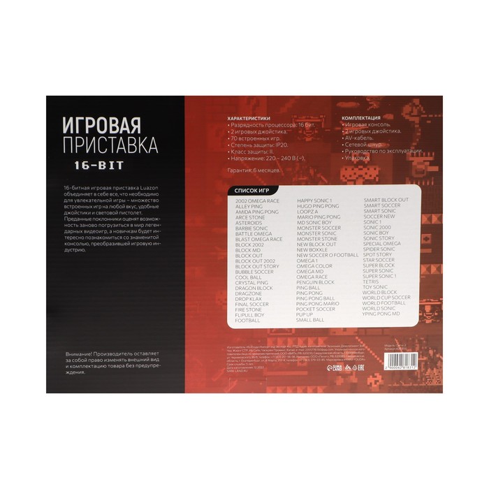 Игровая приставка Luazon Game-2, 16 бит, в комплекте два джойстика, 70 игр, чёрная — Характеристики