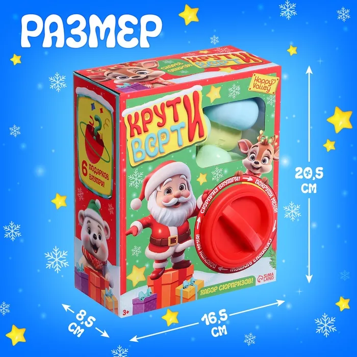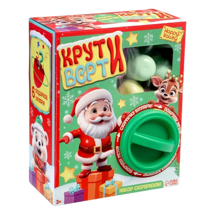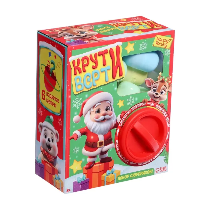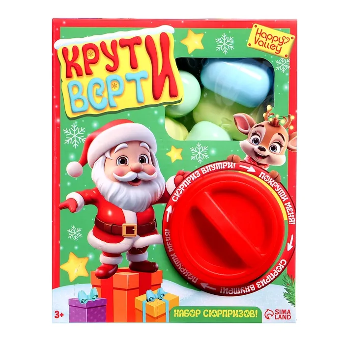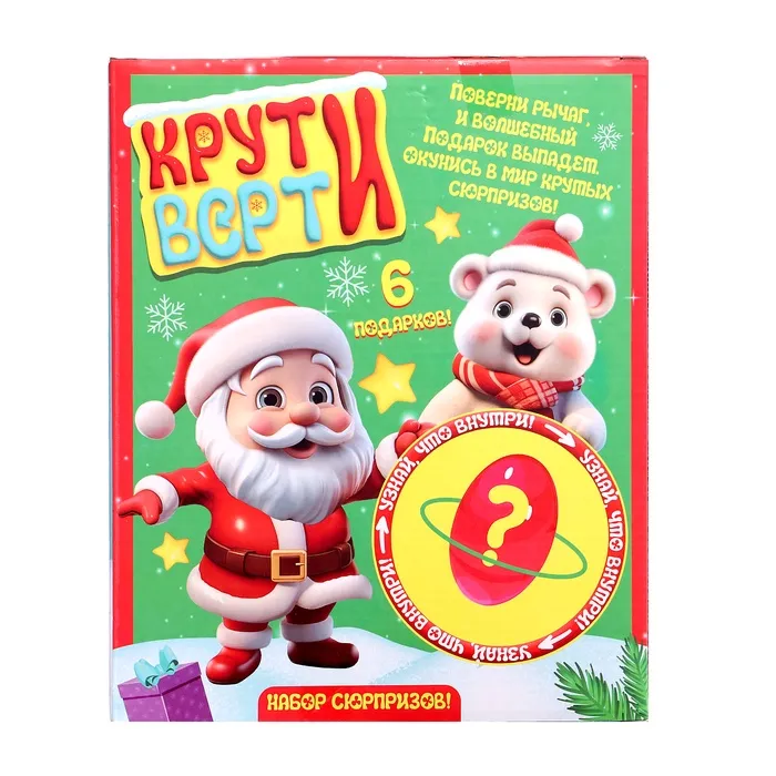 - Автомат оснащен механизмом состоящим из оригинально продуманной коробки и рычага. Создан из прочных материалов: пластик и картон. В наборе представлено 6 игрушек, которые точно порадуют любого ребенка: елка, дед мороз, свинка, собачка, лось,