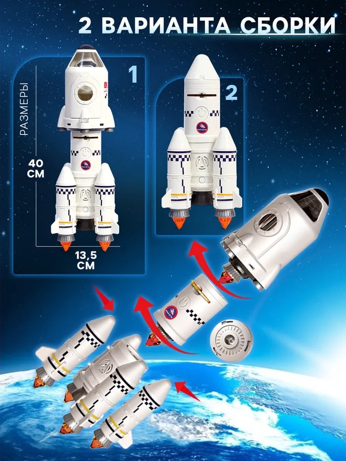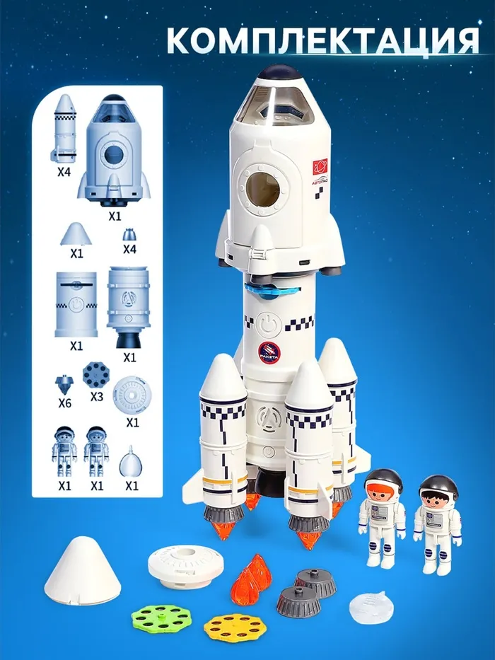 - В комплект входят наклейки для декорирования ракеты и фигурки космонавтов для увлекательных сюжетных игр.