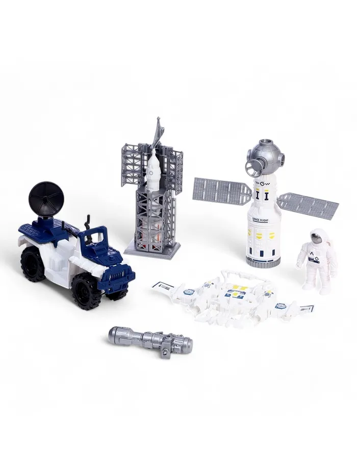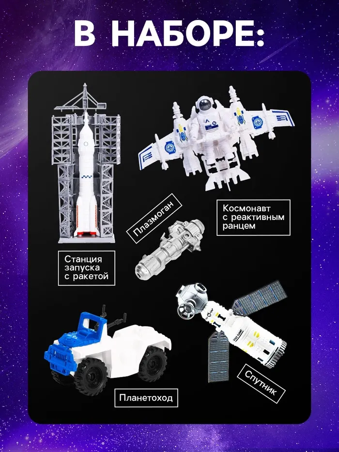 • Содержит 7 предметов: спутник, планетоход, станцию запуска, реактивный ранец, космопушку, космонавта и ракету.