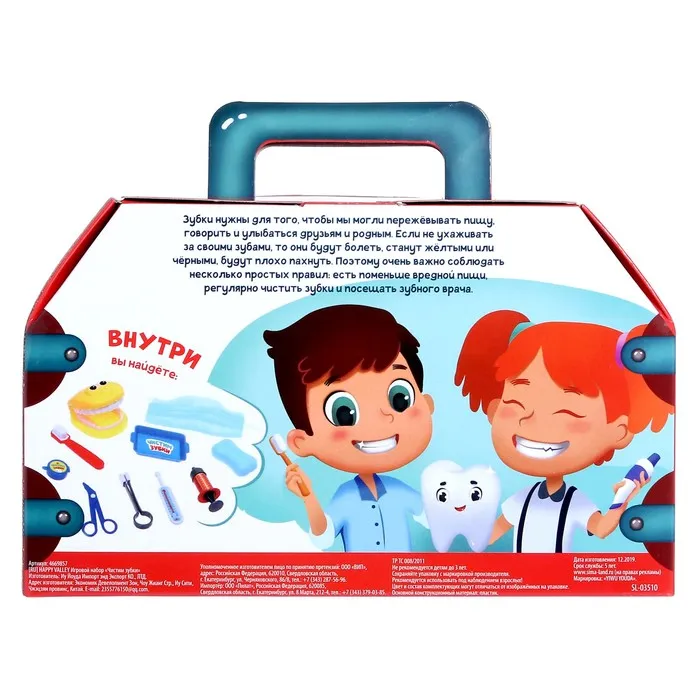 В набор входят инструменты, маска. Челюсть открывается, зубы не съёмные. Ребёнок узнает о строении челюсти, названия зубов и правила гигиены полости рта.