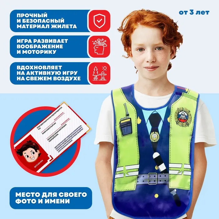 - Жилет выполнен из прочного и безопасного материала. Ваш малыш будет выглядеть настоящим полицейским, готовым к самым важным заданиям.