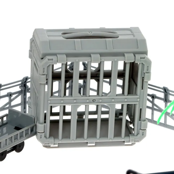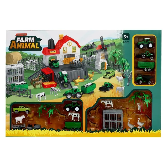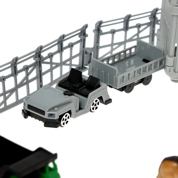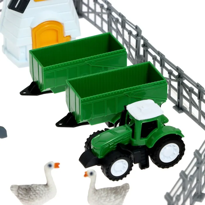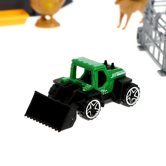 - Транспорт в комплекте – трактор, грузовик с прицепом-клеткой, трактор с прицепом-кормушкой, трактор с самосвальным прицепом, легковой автомобиль и мини-трактор с ковшом.