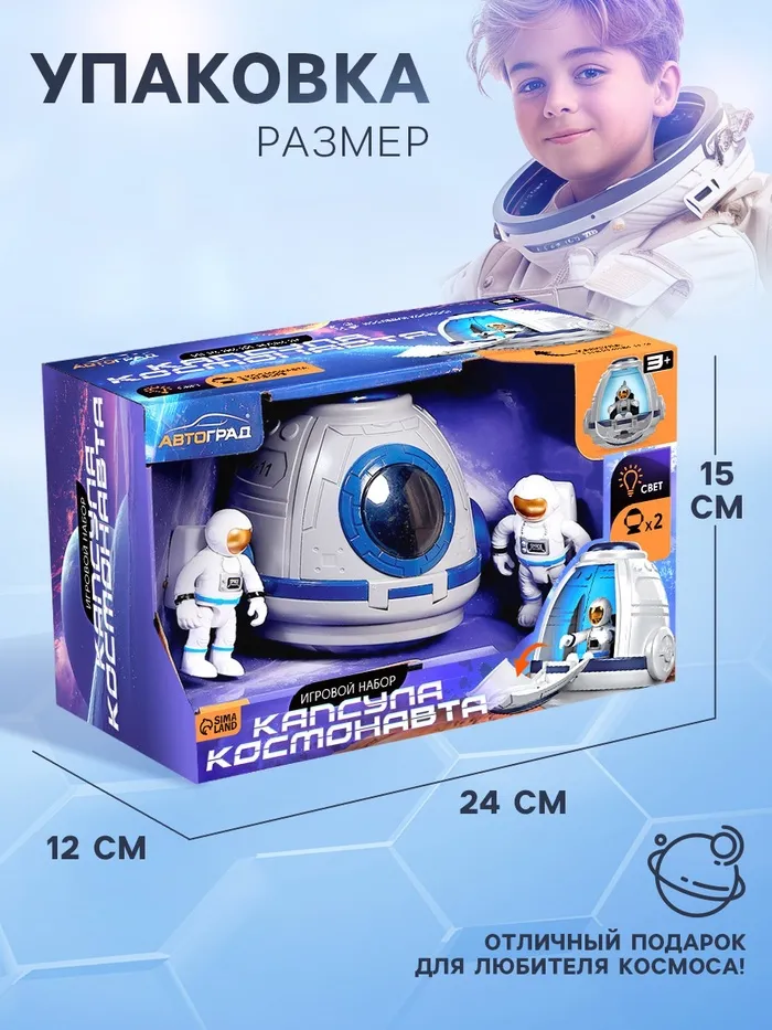 Этот набор станет идеальным выбором для юных исследователей Вселенной. Реалистичная капсула с открывающимися элементами, яркой подсветкой и двумя фигурками космонавтов вдохновит ребёнка на создание фантастических сюжетов и захватывающих историй.
