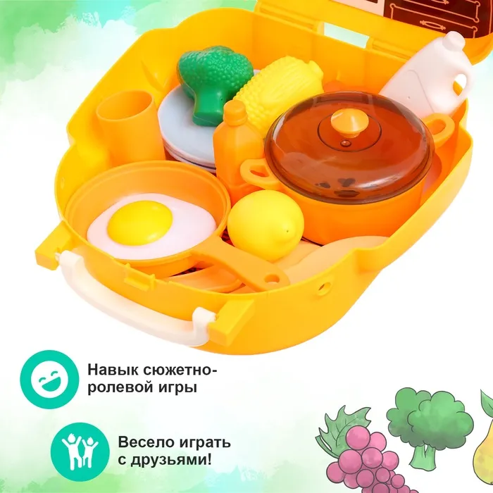 С таким набором ребёнок сможет не только весело провести время, но и развить полезные навыки: мелкую моторику, креативное мышление и социальные навыки. Игры с посудой и продуктами обучают азам приготовления пищи, а чемодан позволяет ребёнку самостоятельно организовывать свои игрушки.