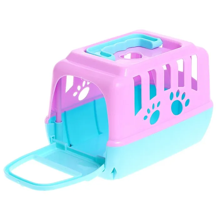 - Переноска выполнена из пластика. У неё есть ручка сверху, чтобы ребёнку было удобно брать питомца с собой куда угодно.