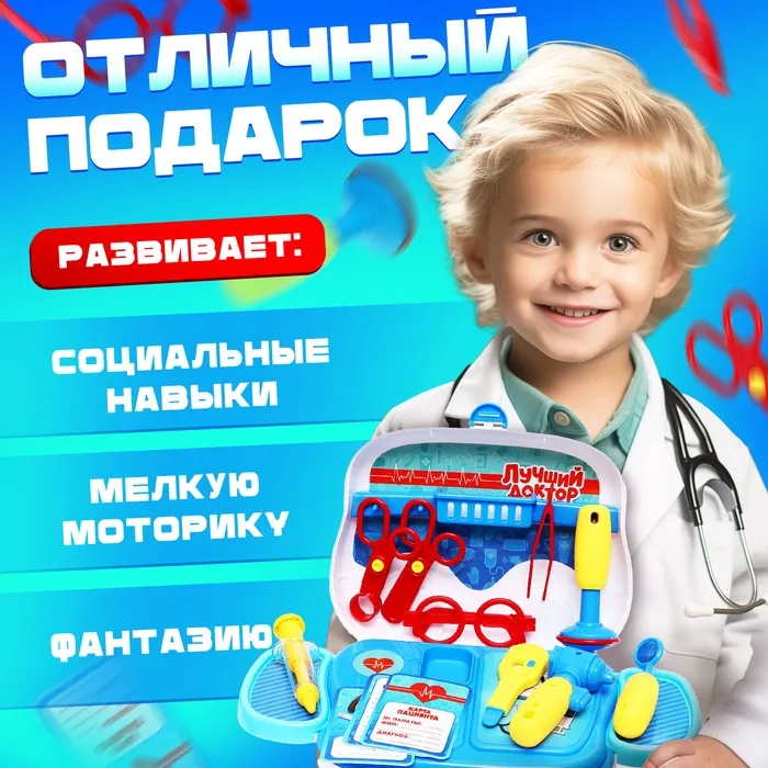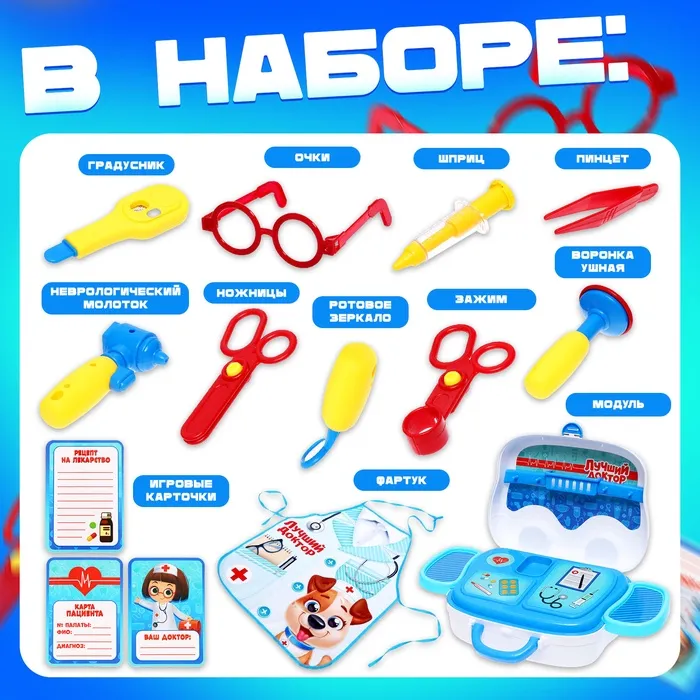 С набором доктора у ребёнка будет всё нужное, чтобы лечить кукол и плюшевых зверей. Разнообразные предметы сделают знакомство с профессией врача увлекательным.