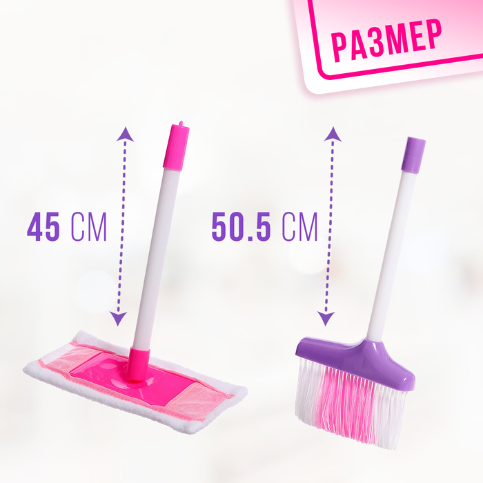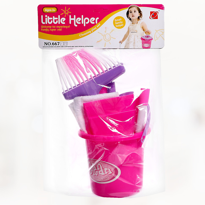 - Полный комплект для уборки: ведро, швабра, метла, совок, щётки, губка и бутылочки. Все предметы подобраны с учётом детского роста и удобны для маленьких рук.