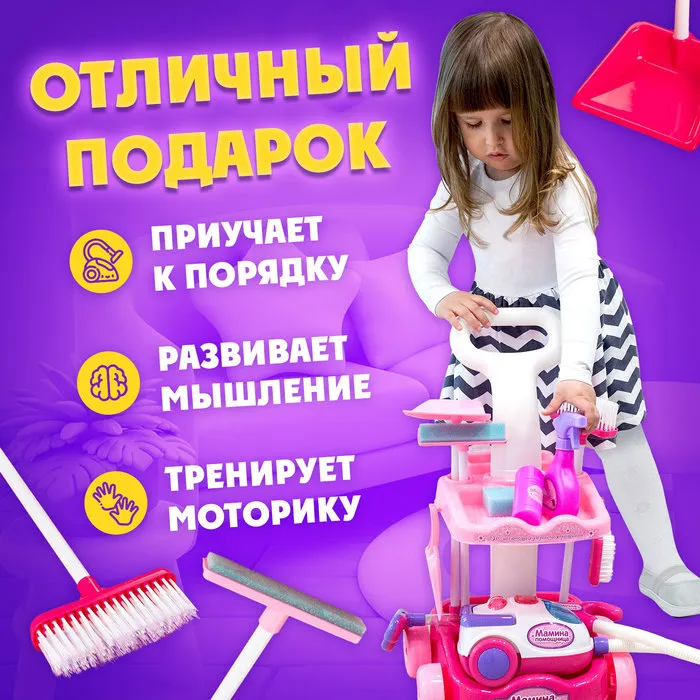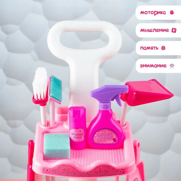 С помощью тележки с моющими средствами мамина помощница наведёт порядок в доме. Маленькая хозяюшка очистит до блеска свой дом, избавится от каждой пылинки и создаст уют.