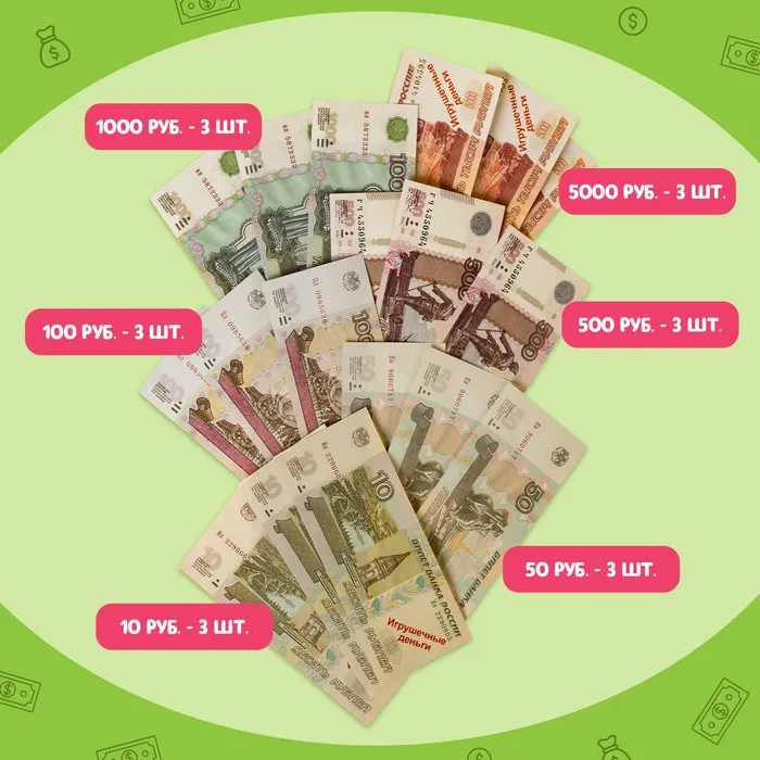 - Банкноты номиналом 5 000, 1 000, 500, 100, 50, 10 рублей — по 3 шт. каждого вида.