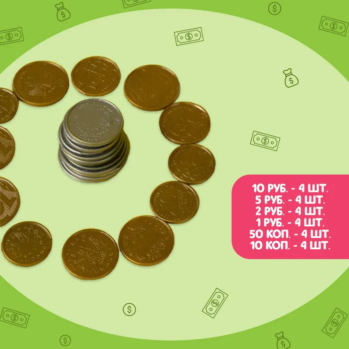- Монеты номиналом 10, 5, 2, 1 рублей, а также 50 и 10 копеек — по 4 шт. каждого вида.