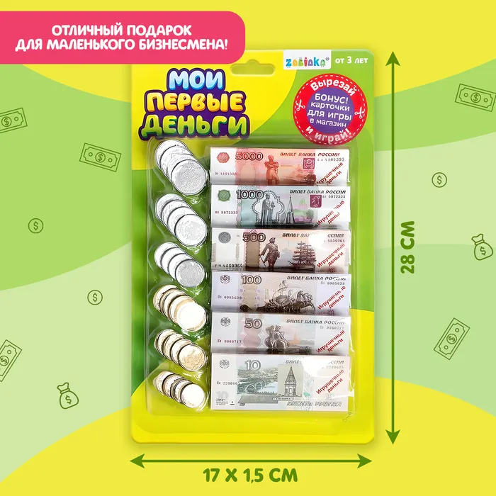 Хотите научить ребёнка правильно обращаться с деньгами? Или сделать сюжетно-ролевые игры более реалистичными? Не проблема! Подарите малышу набор «Мои первые деньги». В яркий комплект входят банкноты и монеты, ценники, списки покупок, таблички со скидками и фишки. Ребёнок сможет разыграть множество сценариев, примеряя на себя роли банкира, продавца, покупателя, фермера и многих других персонажей.
