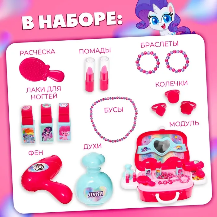 Пусть каждая девочка почувствует себя звездой! Игровой модуль «Студия красоты» My Little Pony — это яркий набор для творческой игры, созданный с любовью к деталям и стилю. Здесь найдётся место для примерок, экспериментов и маленьких открытий. Вместо обычной игрушки — целый мир, в котором малышка становится главным героем.