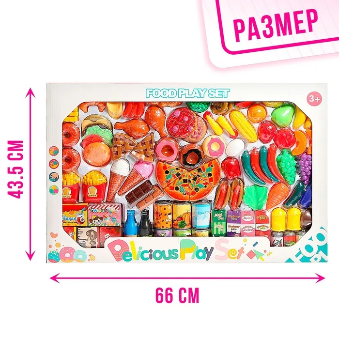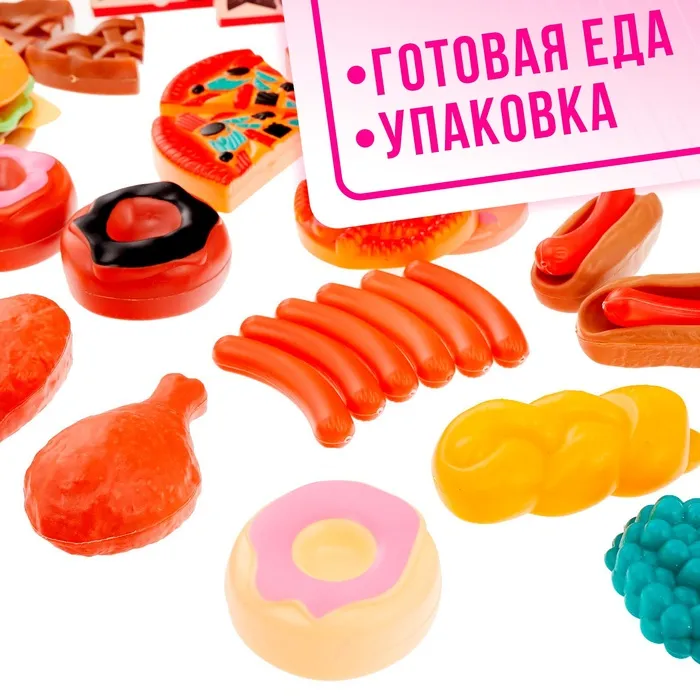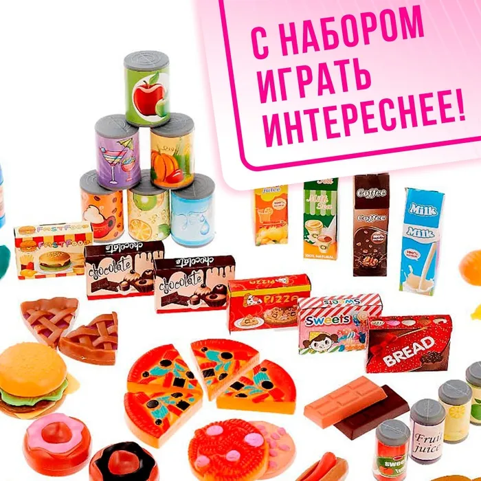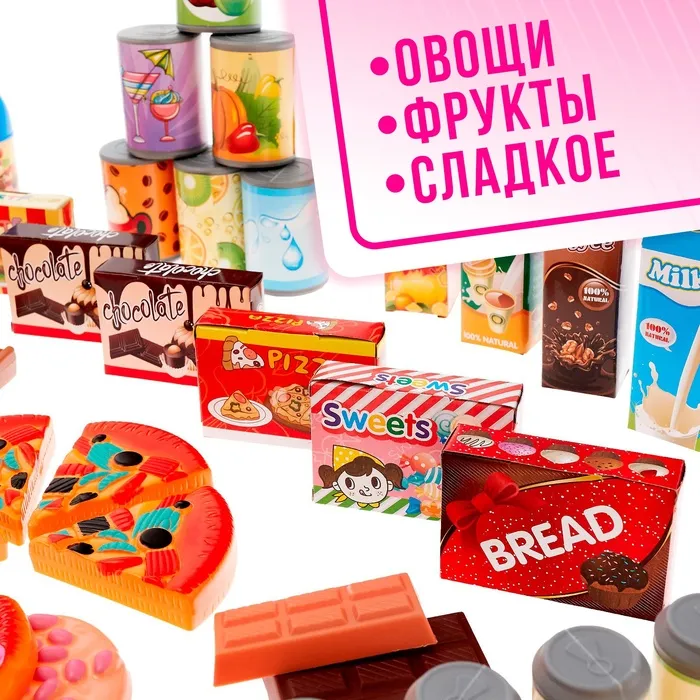 Большой набор продуктов разнообразит сюжетно-ролевые игры и сделает их более реалистичными. Играйте в магазин, ресторан, кафе или устраивайте чаепития с игрушками. В комплекте 120 предметов — овощи, фрукты, готовая еда, соки, газировки, сладости и фастфуд.