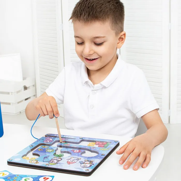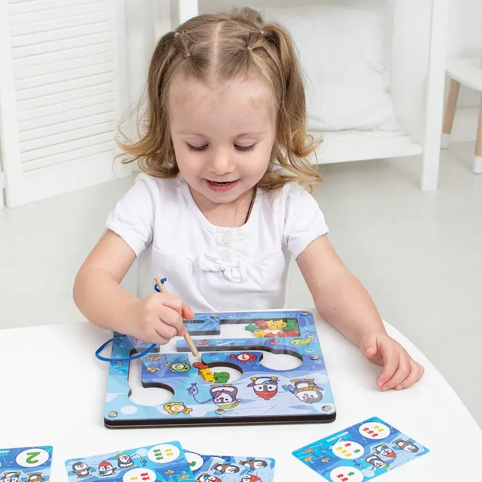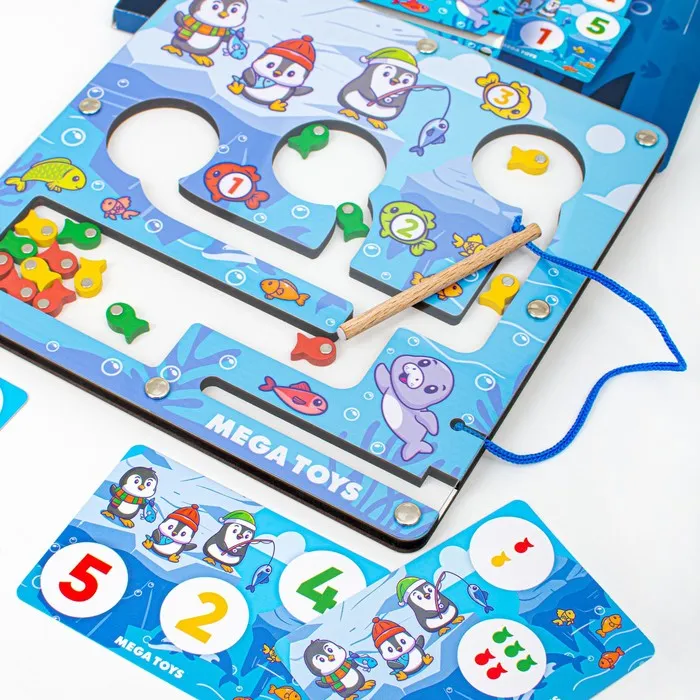 Магнитная рыбалка — это весёлая и увлекательная игра, которая подойдёт для детей в возрасте от 3 лет и старше. Всё просто — с помощью удочки перемещайте рыбок в проруби в соответствии с заданиями на карточках.