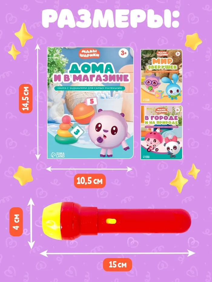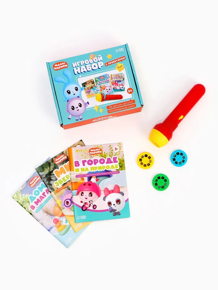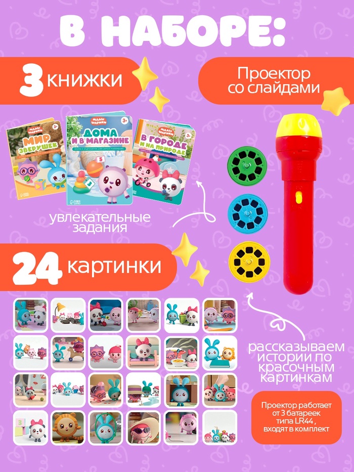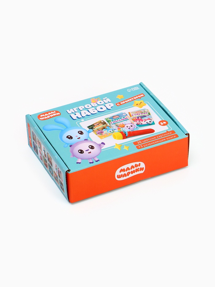 - 3 книги для игр и чтения: в комплекте – книжки-активити с историями о Малышариках. Сочетайте проекцию картинок на стену с чтением, чтобы оживить сказку и сделать её объёмной.