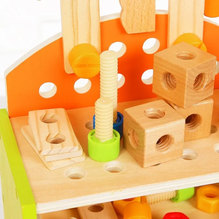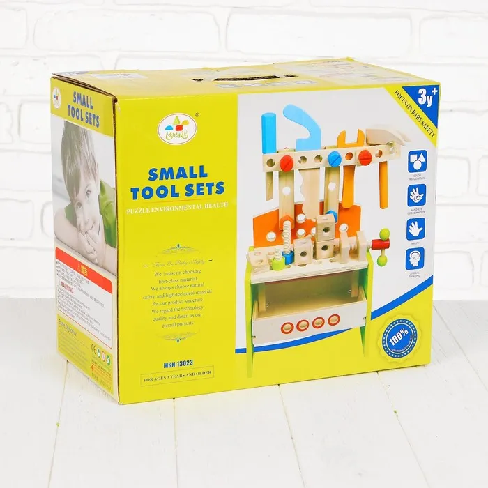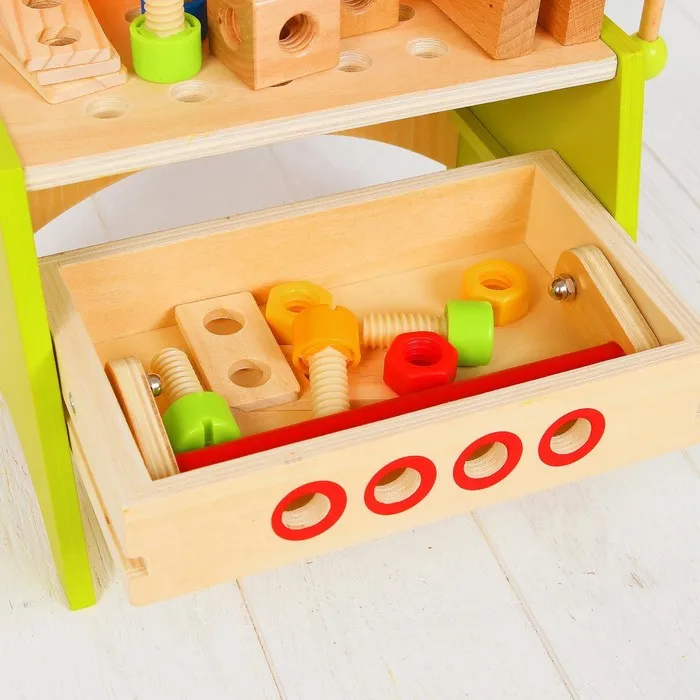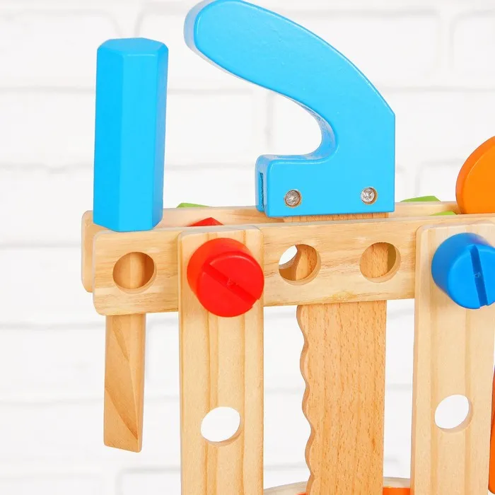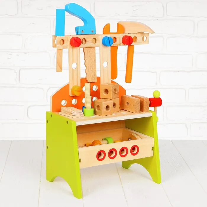 Деревянная мастерская с инструментами — отличный способ познакомить ребёнка с основами работы с инструментами и развить моторику, воображение и усидчивость. Комплект из пила, молотка, ключа и других аксессуаров превращает игру в увлекательный процесс сборки и починки.