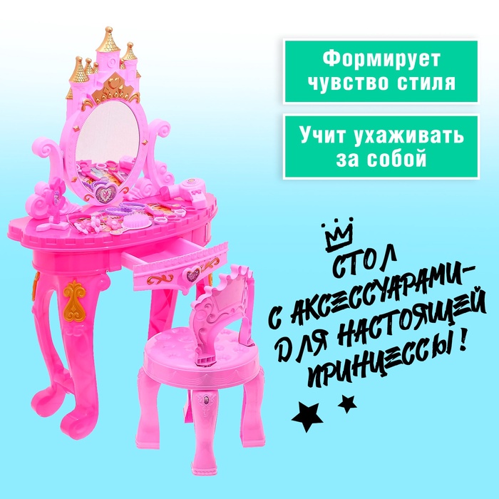 Детский набор «Столик принцессы» со стулом — это элегантная мебель и аксессуары для сюжетно-ролевых игр. Девочка почувствует себя настоящей принцессой примеряя образы.