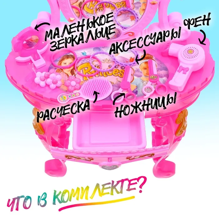 Набор развивает воображение, чувство стиля и координацию движений. Девочка придумывает сюжеты, экспериментирует с образами и учится ухаживать за собой. «Столик принцессы» — отличный подарок для творческих натур, которые любят представлять себя героинями сказок.