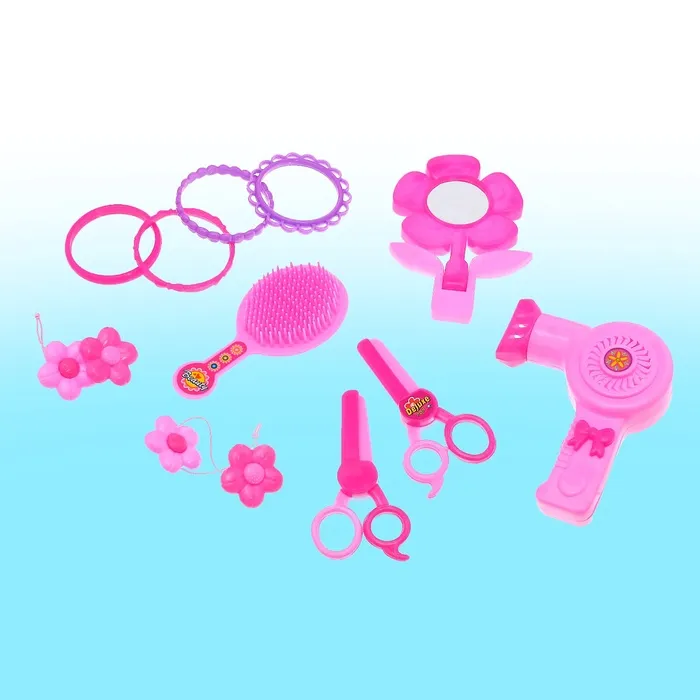 - В набор входит столик с зеркалом, стул и аксессуары — расчёска, фен, ножницы и другие предметы. Зеркало с чётким изображением без искажений помогает создать законченный образ.