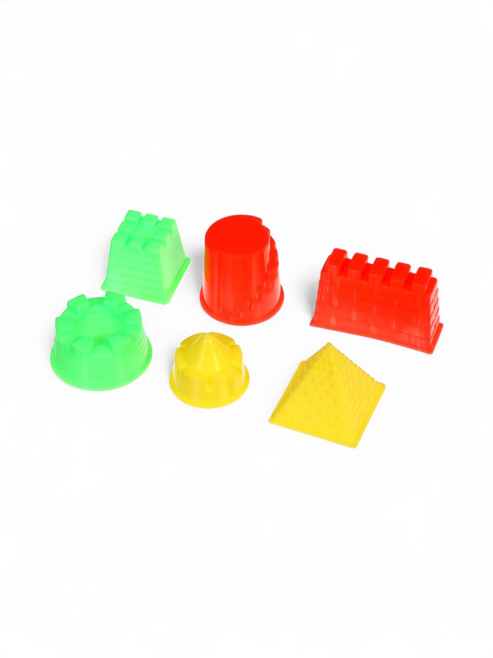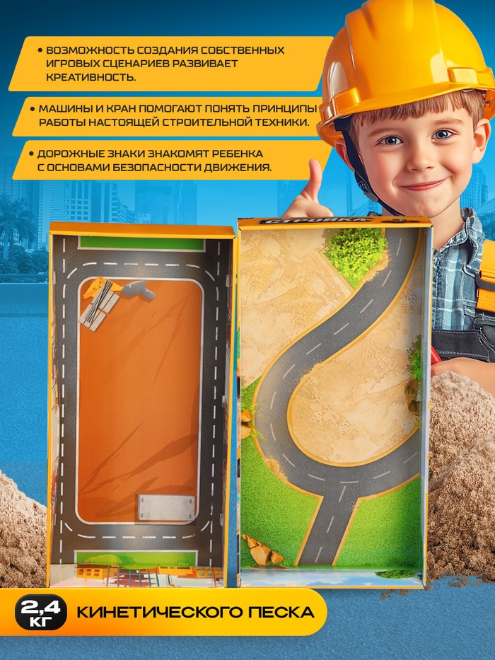 - Кинетический песок в наборе: в комплекте 2,4 кг песка, который легко держит форму. Ребёнок строит из песка здания и дороги, а затем разравнивает поверхность для новых проектов.