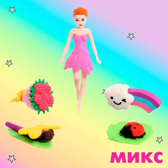 Игровой набор ластиков «Цветочная фея» - это интересное дополнение для игр с куклами и пупсами. В наборе 5 ярких ластиков, каждый из которых выполнен в виде феи и цветов, что делает игру увлекательнее.