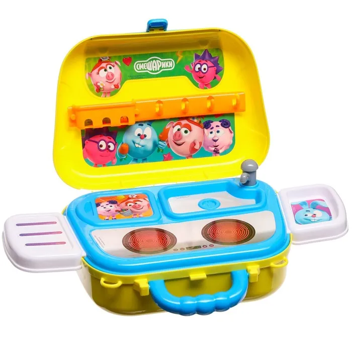 Игровая кухня в чемодане — идеальный старт для маленького гурмана! Игровой набор с героями Смешариков «Весёлая кухня» — это не просто посуда и продукты. Это настоящая кухня, которая умещается в сумочку, а потом раскрывается в полноценный игровой модуль.