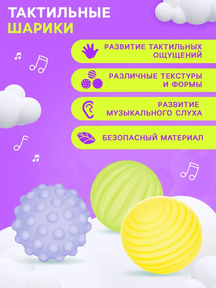 - Три массажных мячика разнообразят игру, стимулируя развитие мелкой моторики и тактильных ощущений.