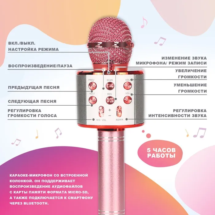 - Микрофон со встроенной колонкой поддерживает воспроизведение аудиозаписей с карты памяти Micro-SD, оснащён функциями записи, регулировки звука, кнопками переключения аудиодорожек.