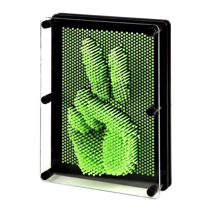 Прежде чем создать слепок, аккуратно опрокиньте рамку горизонтально прозрачной поверхностью вверх, чтобы все стерженьки упали. Их заблокирует прозрачная пластиковая пластина, закрепленная в этой рамке. Затем расположите экспресс-скульптор вертикально и приложите ладонь или какой-нибудь предмет к ровной поверхности гвоздиков. Объёмный отпечаток получается точным.