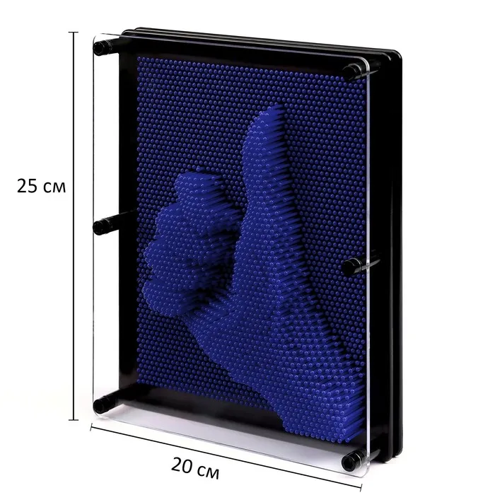 Прежде чем создать слепок, аккуратно опрокиньте рамку горизонтально прозрачной поверхностью вверх, чтобы все стерженьки упали. Их заблокирует прозрачная пластиковая пластина, закрепленная в этой рамке. Затем расположите экспресс-скульптор вертикально и приложите ладонь или какой-нибудь предмет к ровной поверхности гвоздиков. Объёмный отпечаток получается точным.