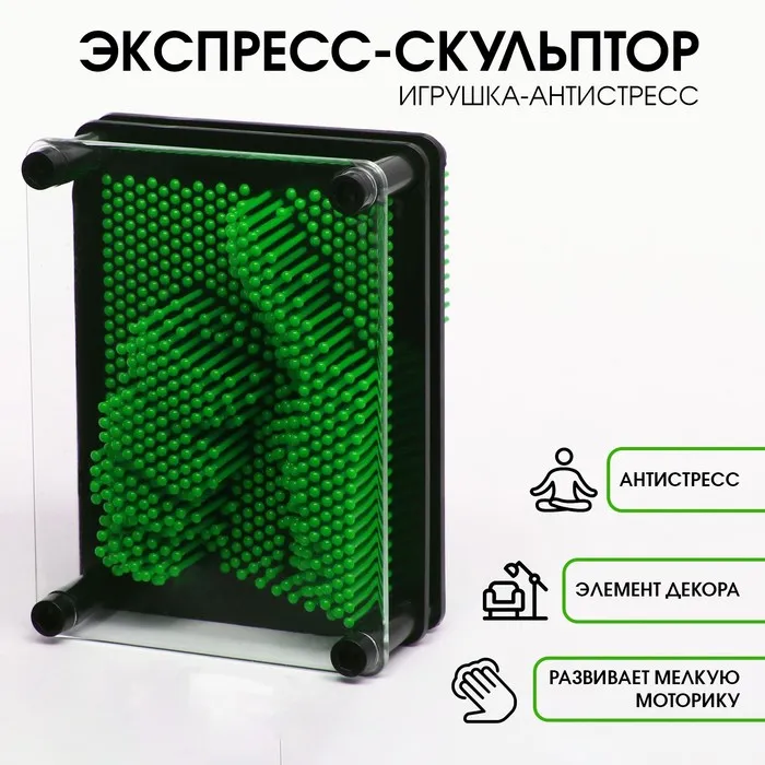 Прежде чем создать слепок, аккуратно опрокиньте рамку горизонтально прозрачной поверхностью вверх, чтобы все стерженьки упали. Их заблокирует прозрачная пластиковая пластина, закрепленная в этой рамке. Затем расположите экспресс-скульптор вертикально и приложите ладонь или какой-нибудь предмет к ровной поверхности гвоздиков. Объёмный отпечаток получается точным.
