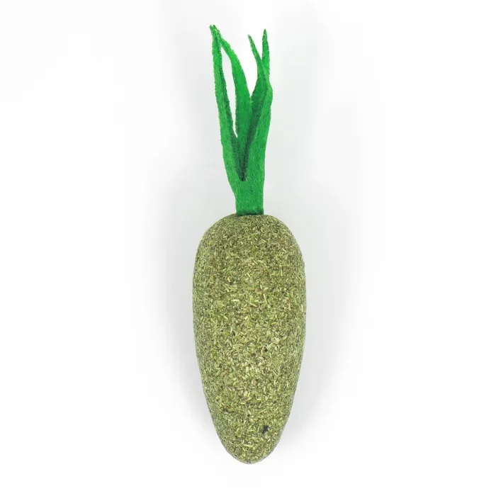 Кошачья мята имеет аромат, который особенно привлекает кошек. Играя с игрушкой, она может облизывать и обнюхивать мяту, что вызывает у нее ощущение удовольствия и блаженства. Сверху игрушки прикреплен мягкий текстиль в виде батвы, напоминая "Морковку".