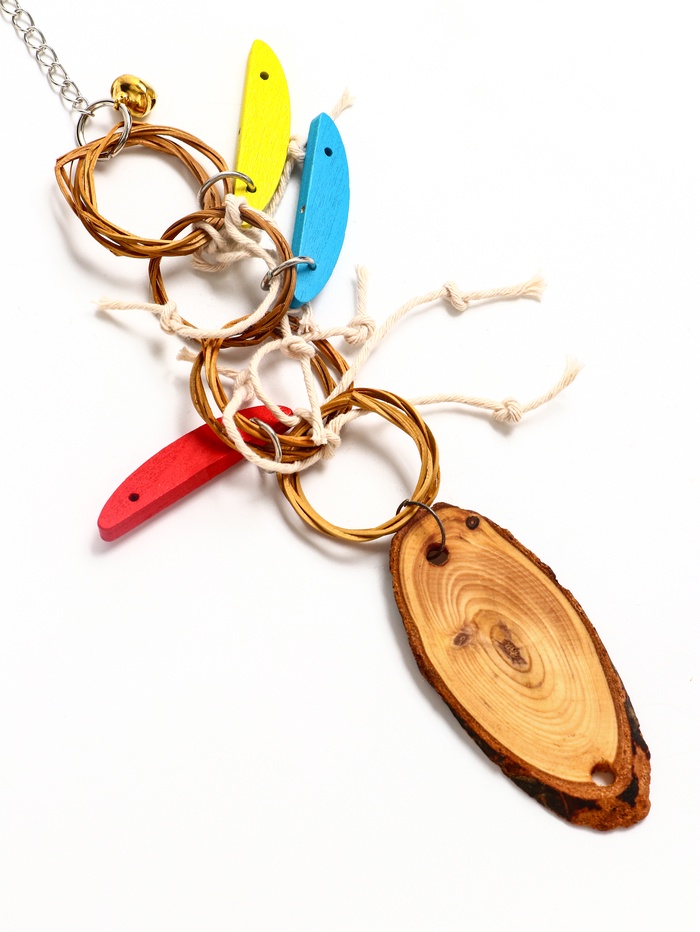 Тишина — не значит скучно: Не каждая игрушка должна звенеть, чтобы быть полезной. Эта работает на визуальное и тактильное вовлечение. Птица учится различать формы, пробует материалы, тянет, крутит, роняет — всё это часть естественного поведения. Особенно актуально для питомцев, склонных к переутомлению от звуковых раздражителей. Простая, но продуманная конструкция помогает поддерживать интерес без перегруза. Добавьте её в зону средней активности — между насестом и кормушкой — и вы увидите, как меняется поведение: меньше покачиваний, больше целенаправленных действий.