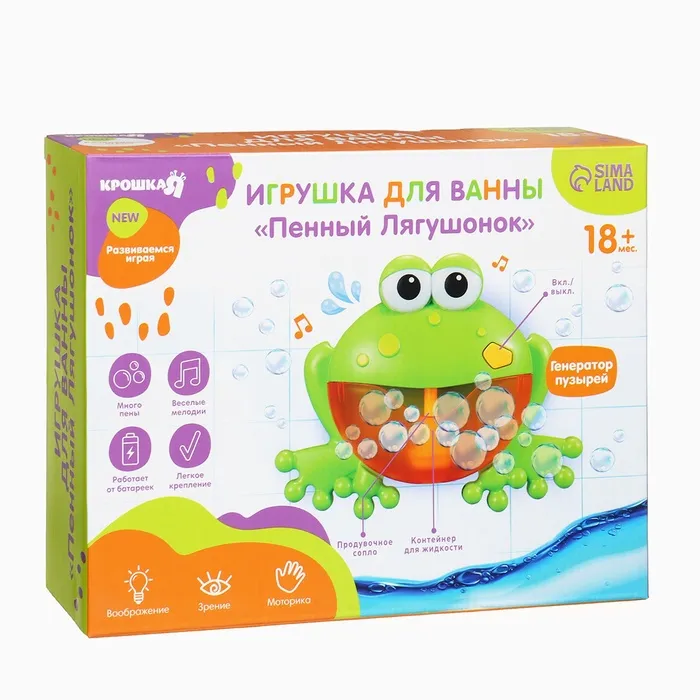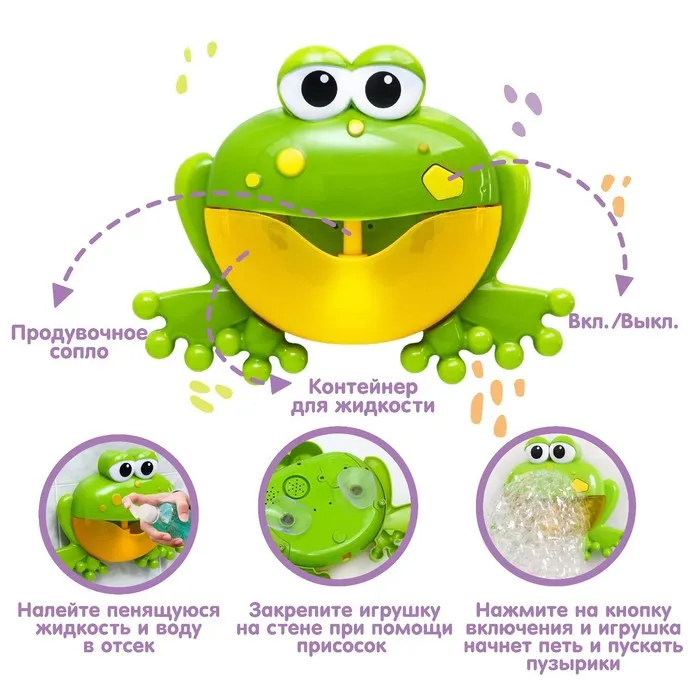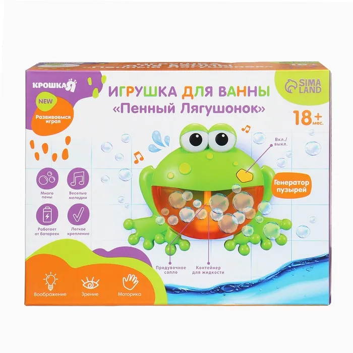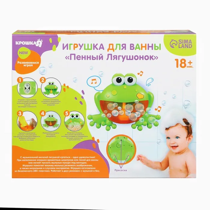 С музыкальной веселой лягушкой купаться одно удовольствие! При наполнении игрушки ароматным шампунем или пеной для ванны, под мелодии она начнет генерировать мыльные пузыри. Игрушка помогает вашему малышу развивать воображение, а также визуальное и слуховое восприятие. Контрастные цвета привлекают внимание и благоприятно влияют на способность фокусировать зрение.