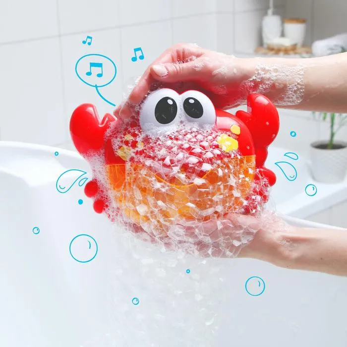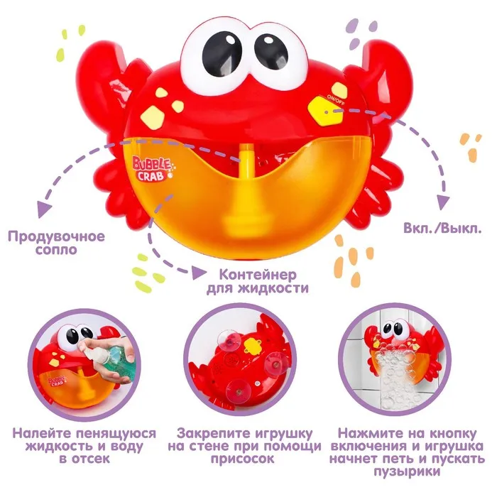 С музыкальным веселым крабом купаться одно удовольствие! При наполнении игрушки ароматным шампунем или пеной для ванны она начнет генерировать мыльные пузыри под приятные мелодии. Игрушка помогает малышу развивать воображение, а также визуальное и слуховое восприятие. Контрастные цвета привлекают внимание и благоприятно влияют на способность фокусировать зрение. Музыкальный краб – это забавные мыльные пузыри для детей, а для остальных членов семьи – возможность сделать себе пену для ванны! Игрушка изготовлена из прочного пластика.