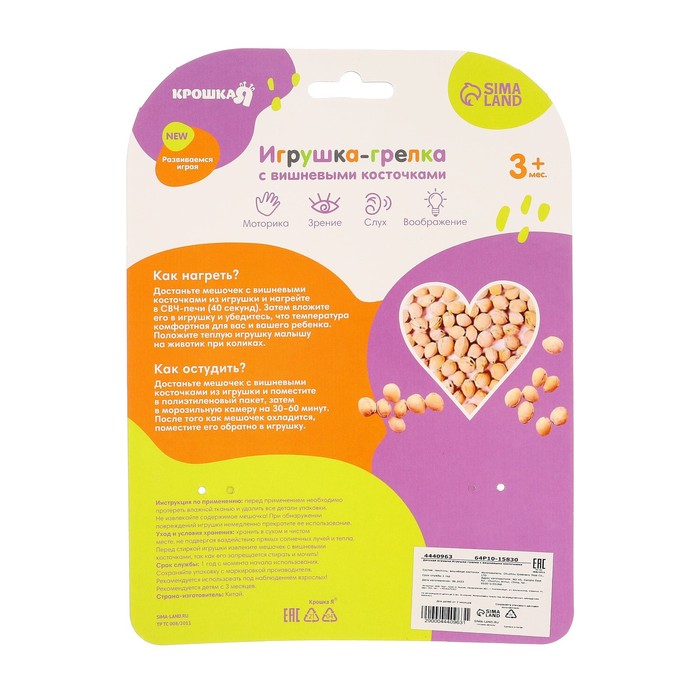 Согревает. Как нагреть? Достаньте подушечку с вишневыми косточками из игрушки и нагрейте в СВЧ печи 40 секунд. Затем вложите подушечку в игрушку и убедитесь, что температура комфортная для вас и вашего ребёнка. Положите теплую игрушку малышу на животик при коликах.