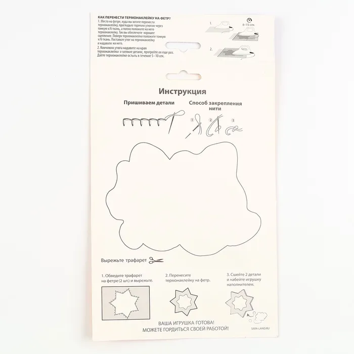 Подготовьте инструменты и рабочее место. Обведите трафарет на фетре и вырежьте две детали. Переведите термонаклейку на фетр ( в этом вам поможет подробная инструкция), сшейте и набейте игрушку наполнителем.