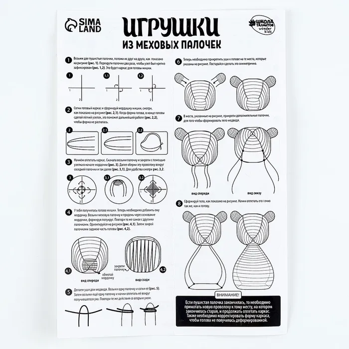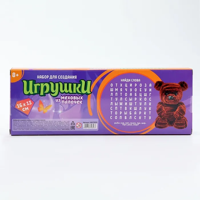 Размер игрушки 16 х 13 см.Количество палочек - 150 шт.Всё необходимое входит в набор.Возрастная категория 8+.Игрушка из меховых палочек станет отличным подарком для всех детей и взрослых.