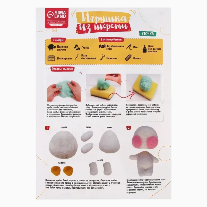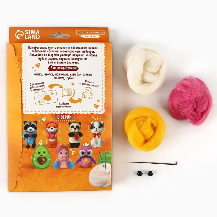 В этом наборе собрано всё самое необходимое для создания своими руками игрушки в технике сухого валяния. Раньше чтобы смастерить что-то подобное приходилось искать шерсть разных цветов в магазине, у бабушки, в маминых коробочках с пряжей, а теперь всё необходимое есть в комплекте для творчества. Теперь каждый, даже начинающий любитель фелтинга, быстро смастерит красивую игрушку.