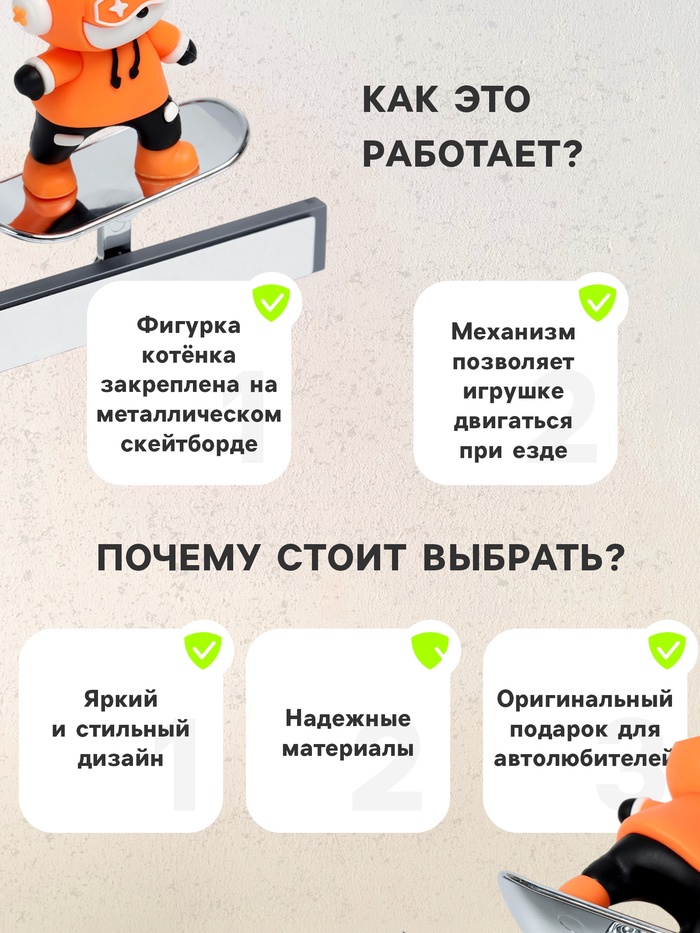 Этот стильный аксессуар станет прекрасным подарком для всех, кто любит необычные детали в автомобиле. Забавный котёнок на скейтборде подчеркнёт индивидуальность владельца и создаст позитивную атмосферу в салоне.