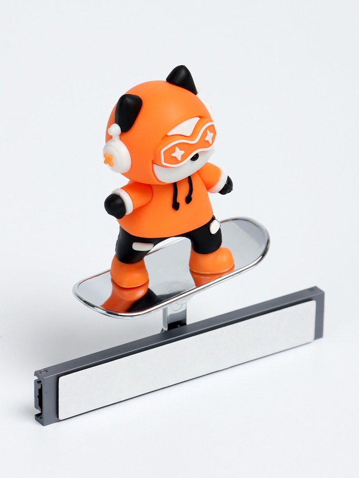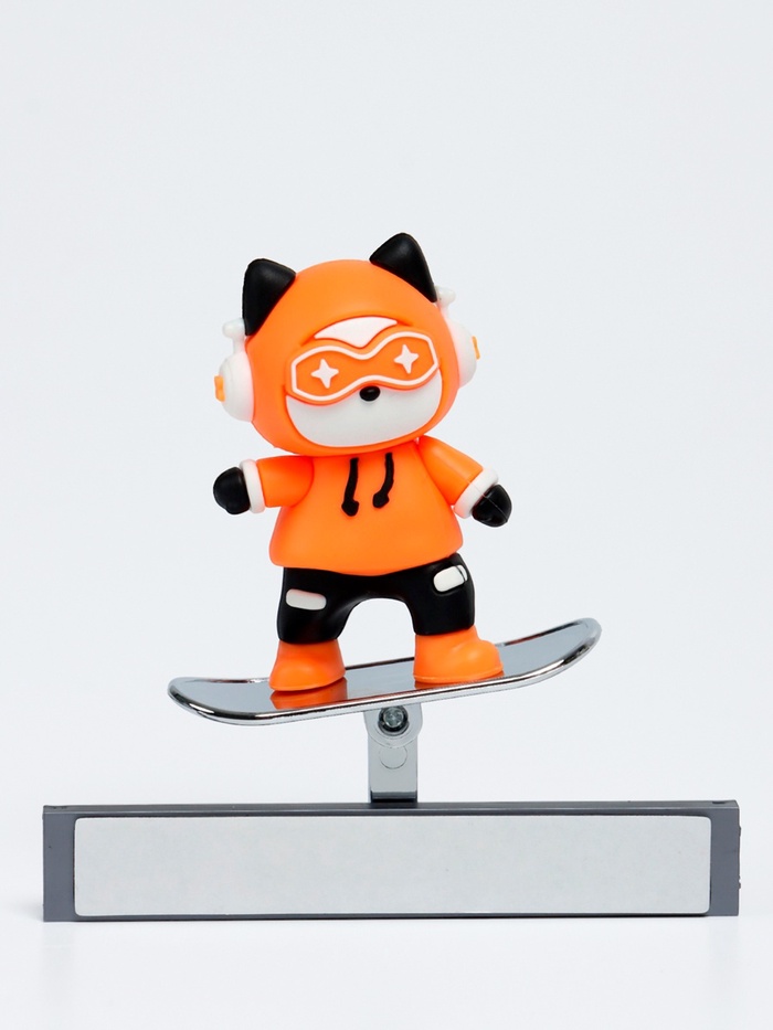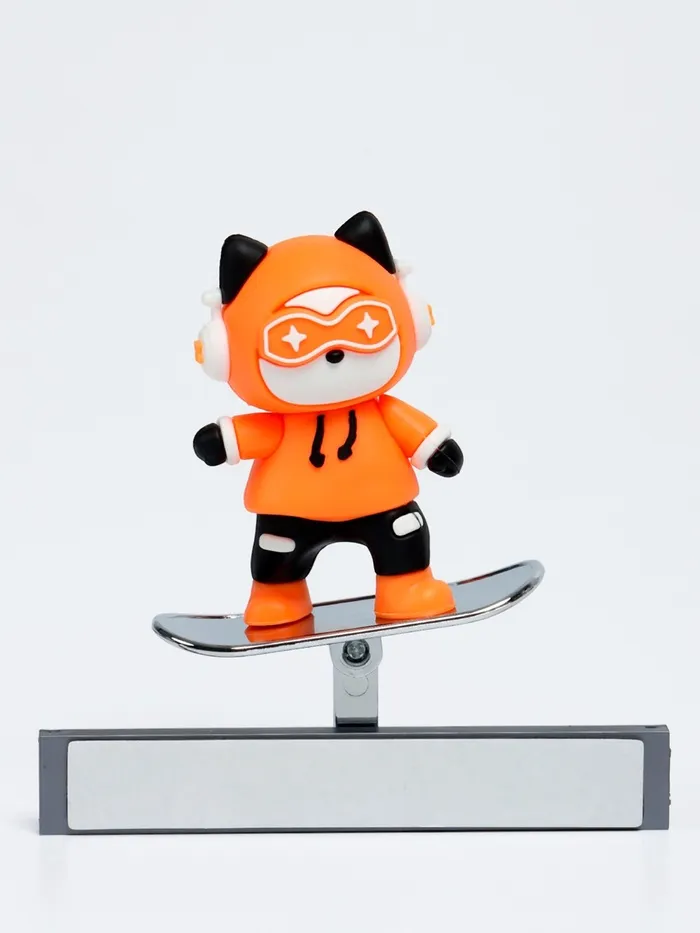 Фигурка выполнена в виде забавного котёнка в спортивном костюме и очках. Яркий оранжевый цвет придаёт аксессуару выразительность, а качественная детализация делает его привлекательным. Установленный на подвижном механизме, котёнок раскачивается при движении, создавая эффект катания на скейтборде.