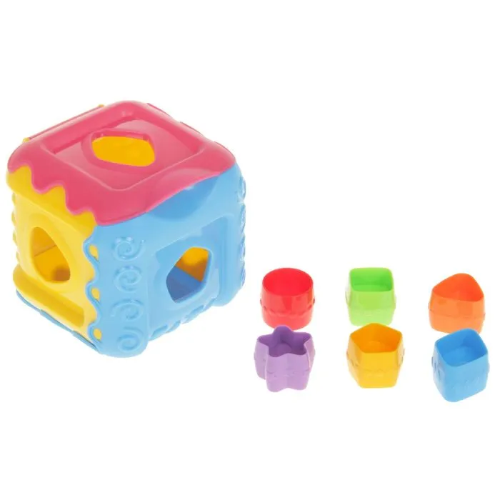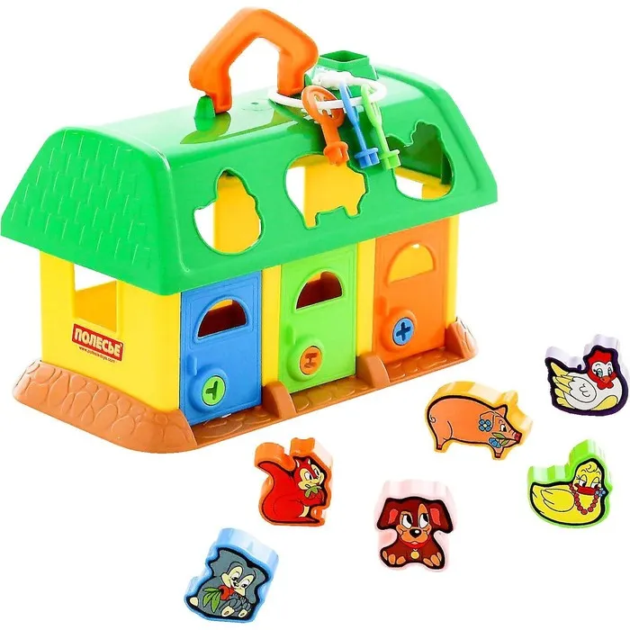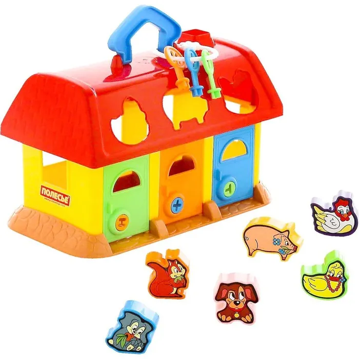 У игрушки есть три дверки, за каждой живёт зверёк. На крыше дома расположены отверстия, к которым нужно правильно подобрать фигурки животных. А для того, чтобы вынуть формочки обратно, ребёнок должен открыть двери подходящим ключом.