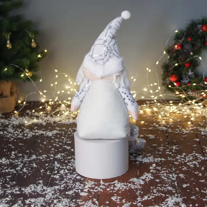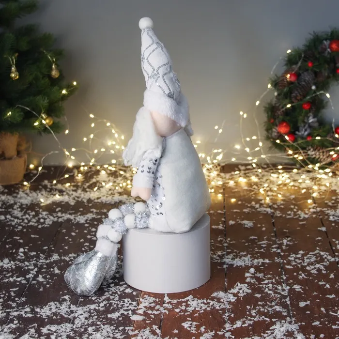 Мягкая новогодняя игрушка в виде Деда Мороза в костюмчике с пайетками станет ярким украшением праздничного интерьера или оригинальным подарком на Новый год. Эта фигурка выполнена в классическом стиле с элементами ар-деко и скандинавского дизайна, что придает ей особую элегантность. Размер — 49 см в высоту и 17 см в ширину, что делает её заметным декоративным элементом. Мягкое тело с мягконабивными частями обеспечивает приятные тактильные ощущения и долговечность. Наличие ног у куклы создает реалистичный силуэт, а серебристо-белая палитра с пайетками добавляет праздничного блеска и изящества. Игрушка не оснащена подставкой и не требует питания, что облегчает её размещение в различных пространствах.
