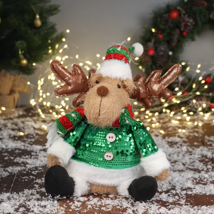 - Облачён в красно-зеленый новогодний костюм с элементами сияния, создающими эффект праздничного блеска.
