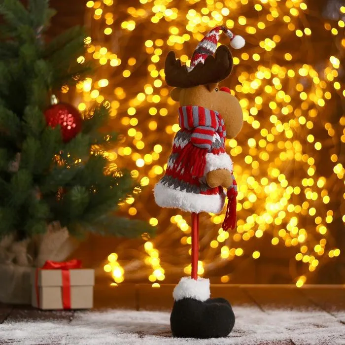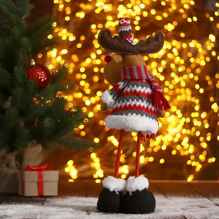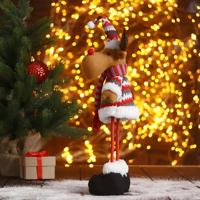 - С длинными ногами — уверенная позиция: Игрушка сохраняет вертикальное положение, её можно размещать на столе, подоконнике или рядом с ёлкой без дополнительных креплений.