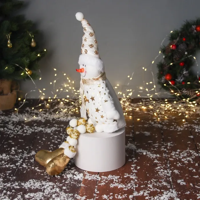 Эта мягкая игрушка добавит волшебства и уюта в любой дом во время новогодних праздников. Её размеры позволяют разместить её у камина, на полке или у входной двери. Золотисто-белый цвет и стильный дизайн создают атмосферу сказочного праздника. Такой снеговик станет не только декоративным элементом, но и любимой игрушкой для детей, наполняя дом атмосферой зимней сказки и новогоднего волшебства.